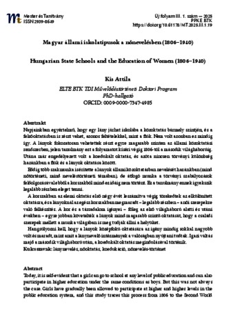 Kis, Attila (2025) Magyar állami iskolatípusok a nőnevelésben (1806–1940) = Hungarian State Schools and the Education of Women (1806–1940). MESTER ÉS TANÍTVÁNY, 3 (1). pp. 237-248. ISSN 1785-4342
