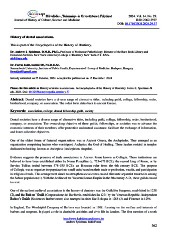 Spielman, Andrew I. and Forrai, Judit (2024) History of dental associations. KALEIDOSCOPE: MŰVELŐDÉS- TUDOMÁNY- ÉS ORVOSTÖRTÉNETI FOLYÓIRAT, 14 (29). pp. 362-367. ISSN 2062-2597