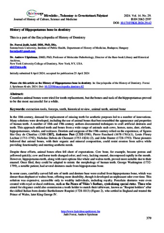 Spielman, Andrew I. and Forrai, Judit (2024) History of Hippopotamus bone in dentistry. KALEIDOSCOPE: MŰVELŐDÉS- TUDOMÁNY- ÉS ORVOSTÖRTÉNETI FOLYÓIRAT, 14 (29). pp. 379-380. ISSN 2062-2597