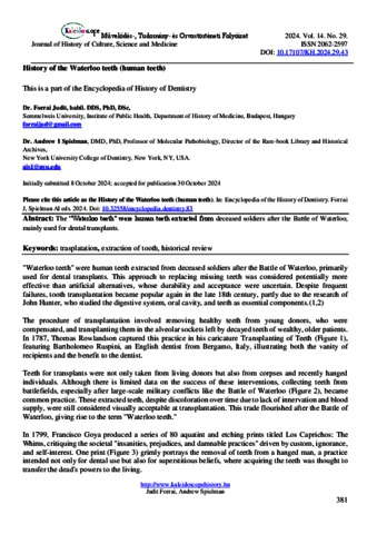 Forrai, Judit and Andrew I., Spielman (2024) History of the Waterloo teeth (human teeth). KALEIDOSCOPE: MŰVELŐDÉS- TUDOMÁNY- ÉS ORVOSTÖRTÉNETI FOLYÓIRAT, 14 (29). pp. 381-383. ISSN 2062-2597