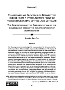 he Chapter presents the functioning of the representation of the Government before the European Court of Human Rights. It presents the establishment of the Agency of the Government in 1994. In connection with the organisation and tasks of the Agency it shows all forms of the activity of the Agency, focusing the ‘Strasbourg Proofing’, the enforcement of judgments and the promotion of human rights. The Chapter presents the whole procedure of the European Court of Human Rights, from the beginning (submitting an application) to the final phase (enforcement of judgments). The procedure of submitting an Application to the Court is a crucial point in the proceedings before the Court. The biggest challenges of the last several years are also illustrated. In connection with the prison overcrowding almost 9,000 applications had been submitted by the applicants. The domestic remedy introduced by the authorities was found effective which met the criteria set out in the pilot judgment given in the case of Varga and Others v Hungary. The problem of length of proceedings is an ongoing challenge.In 2021, a new domestic compensatory remedy was also introduced for civil court proceedings (Act no. XCIV of 2021). The judgment of 30 March 2023 in the case of Szaxon v Hungary held, that Act no. XCIV of 2021 set out an effective remedy for protracted civil proceedings. The Chapter also gives a description about the Baka Case. The role of the Parliament in the implementation of ECtHR judgments which is a lesser-known aspect of the implemtation of the judgments is also part of the Chapter. The chapter intends to demonstrate the complexity of the activities of the Agency of the Government in the European Court of Human Rights proceedings.