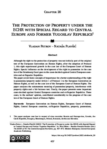 Petrov, Vladan and Plavšić, Nataša (2025) The Protection of Property under the ECHR with Special Regard to Central Europe and Former Yugoslav Republics. In: The ECHR at 70: The Central European Narrative. Studies Of The Central European Professors’ Network . Central European Academic Publishing, Miskolc - Budapest, pp. 457-473. ISBN 978-615-6474-87-2 (print) 978-615-6474-88-9 (pdf) 978-615-6474-89-6 (epub)