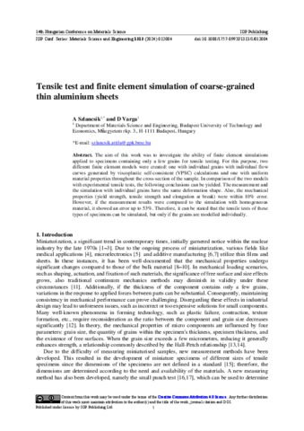 Szlancsik, Attila and Varga, Dorottya (2024) Tensile test and finite element simulation of coarse-grained thin aluminium sheets. IOP CONFERENCE SERIES: MATERIALS SCIENCE AND ENGINEERING, 1313. No.-012004. ISSN 1757-8981
