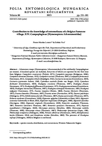 Libert, Pierre-Nicolas and Vas, Zoltán (2025) Contribution to the knowledge of entomofauna of a Belgian Famenne village. XIV. Campopleginae (Hymenoptera: Ichneumonidae). FOLIA ENTOMOLOGICA HUNGARICA, 86. pp. 151-181. ISSN 0373-9465