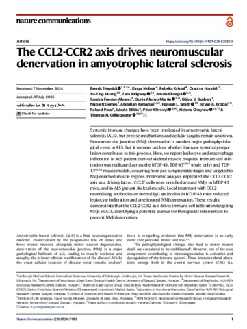 Nógrádi, Bernát and Molnár, Kinga and Kristóf, Rebeka and Horváth, Orsolya and Huang, Yu-Ting and Ridgway, Zara and Elicegui, Amaia and Fuertes-Alvarez, Sandra and Alonso-Martin, Sonia and Szebeni, Gábor and Gémes, Nikolett and Ramadan, Abdullah and Smith, Hannah L. and Krizbai, István Adorján and Patai, Roland and Siklós, László and Klivényi, Péter and Chaytow, Helena and Gillingwater, Thomas H. (2025) The CCL2-CCR2 axis drives neuromuscular denervation in amyotrophic lateral sclerosis. NATURE COMMUNICATIONS, 16 (1). No. 7053. ISSN 2041-1723