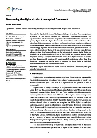 Szabó, Zsolt Roland (2024) Overcoming the digital divide : A conceptual framework. JOURNAL OF INFRASTRUCTURE POLICY AND DEVELOPMENT, 8 (16). No. 10082. ISSN 2572-7923