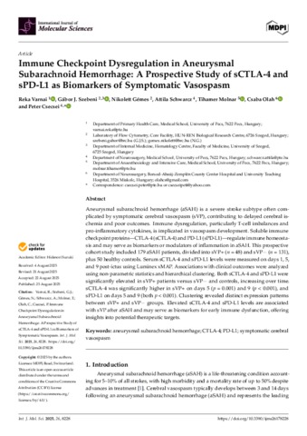 Várnai, Réka and Szebeni, Gábor and Gémes, Nikolett and Schwarcz, Attila and Molnár, Tihamér and Olah, Csaba and Csécsei, Péter (2025) Immune Checkpoint Dysregulation in Aneurysmal Subarachnoid Hemorrhage: A Prospective Study of sCTLA-4 and sPD-L1 as Biomarkers of Symptomatic Vasospasm. INTERNATIONAL JOURNAL OF MOLECULAR SCIENCES, 26 (17). No.-8228. ISSN 1661-6596