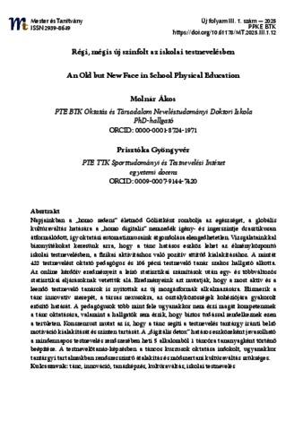 Molnár, Ákos and Prisztóka, Gyöngyvér (2025) Régi, mégis új színfolt az iskolai testnevelésbn. MESTER ÉS TANÍTVÁNY, 3 (1). pp. 151-165. ISSN 1785-4342