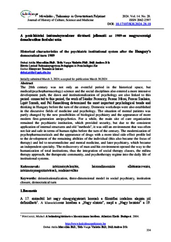 Dobai, Attila Marcelián and Tóth-Varga, Violetta and Dúll, Andrea (2024) A pszichiátriai intézményrendszer történeti jellemzői az 1989-es magyarországi demokratikus fordulat után. KALEIDOSCOPE: MŰVELŐDÉS- TUDOMÁNY- ÉS ORVOSTÖRTÉNETI FOLYÓIRAT, 2024 (28). pp. 334-347. ISSN 2062-2597