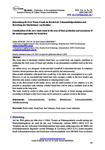 Köhler, Nadine and Patrick, Siegfried (2024) Betrachtung des Zero Waste-Trends im Bereich der Lebensmittelproduktion und Bewertung der Marktchance von Brotbier. KALEIDOSCOPE: MŰVELŐDÉS- TUDOMÁNY- ÉS ORVOSTÖRTÉNETI FOLYÓIRAT, 14 (28). pp. 103-124. ISSN 2062-2597