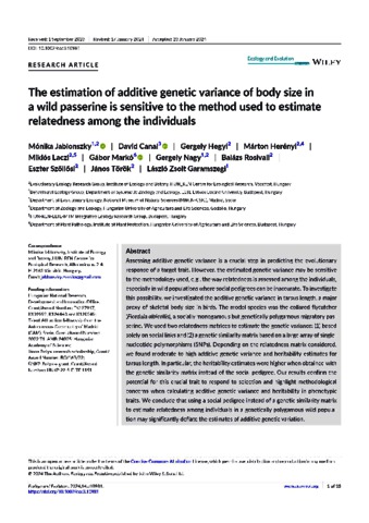 Jablonszky, Mónika and Canal, David and Hegyi, Gergely and Herényi, Márton and Laczi, Miklós and Markó, Gábor and Nagy, Gergely and Rosivall, Balázs and Szöllősi, Eszter and Török, János and Garamszegi, László Zsolt (2024) The estimation of additive genetic variance of body size in a wild passerine is sensitive to the method used to estimate relatedness among the individuals. ECOLOGY AND EVOLUTION, 14. No. e10981. ISSN 2045-7758