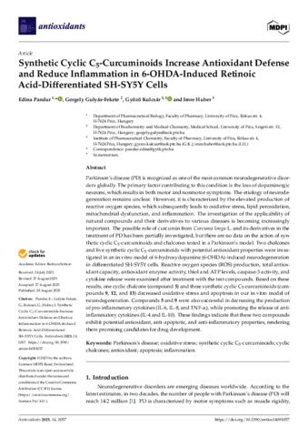 Pandur, Edina and Gulyás, Gergely and Kulcsár, Győző and Huber, Imre (2025) Synthetic Cyclic C5-Curcuminoids Increase Antioxidant Defense and Reduce Inflammation in 6-OHDA-Induced Retinoic Acid-Differentiated SH-SY5Y Cells. ANTIOXIDANTS, 14 (9). No. 1057. ISSN 2076-3921