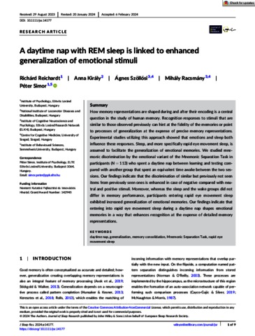 Reichardt, Richárd and Király, Anna and Szőllősi, Ágnes and Racsmány, Mihály and Simor, Péter (2024) A daytime nap with REM sleep is linked to enhanced pattern completion for emotional stimuli. JOURNAL OF SLEEP RESEARCH. No. e14177. ISSN 0962-1105 (print); 1365-2869 (online)