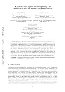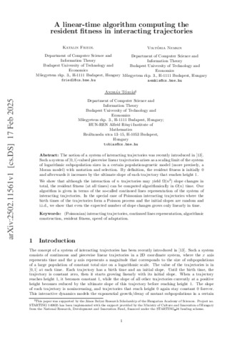 Abstract: The notion of a system of interacting trajectories was recently introduced in [13]. Such a system of [0 , 1]-valued piecewise linear trajectories arises as a scaling limit of the system of logarithmic subpopulation sizes in a certain population-genetic model (more precisely, a Moran model) with mutation and selection. By definition, the resident fitness is initially 0 and afterwards it increases by the ultimate slope of each trajectory that reaches height 1. We show that although the interaction of n trajectories may yield Ω( n 2 ) slope changes in total, the resident fitness (at all times) can be computed algorithmically in O ( n) time. Our algorithm is given in terms of the so-called continued lines representation of the system of interacting trajectories. In the special case of Poissonian interacting trajectories where the birth times of the trajectories form a Poisson process and the initial slopes are random and i.i.d., we show that even the expected number of slope changes grows only linearly in time.