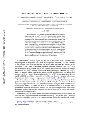 González, Casanova Adrián and Tóbiás, András József and Valesin, Daniel (2024) Scaling limit of an adaptive contact process. ANNALS OF PROBABILITY, 52 (1). pp. 296-349. ISSN 0091-1798