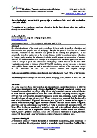 Forrai, Judit (2024) Szexuálpedagógia, szexedukáció percepciója a rendszerváltás utáni első évtizedben 1990-2000 között. KALEIDOSCOPE: MŰVELŐDÉS- TUDOMÁNY- ÉS ORVOSTÖRTÉNETI FOLYÓIRAT, 14 (28). pp. 348-378. ISSN 2062-2597