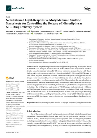 Abdelghafour, Mohamed M. and Imre-Deák, Ágota and Amin, Keristina and Czimer, Zsófia and Veronika, Czike Flóra and Péter, Viktória and Berkecz, Róbert and Bari, Ferenc and Janovák, László (2025) Near-Infrared Light-Responsive Molybdenum Disulfide Nanosheets for Controlling the Release of Nimodipine as NIR-Drug Delivery System. MOLECULES, 30 (3). No.-497. ISSN 1431-5157
