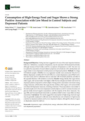 Dobai, Tabita and Baksa, Dániel and Gonda, Xénia and Juhász, Gabriella and Eszlári, Nóra and Bagdy, György (2025) Consumption of High-Energy Food and Sugar Shows a Strong Positive Association with Low Mood in Control Subjects and Depressed Patients. NUTRIENTS, 17 (16). No.-2594. ISSN 2072-6643