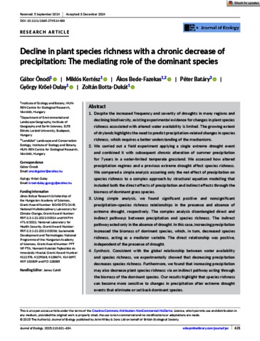 Ónodi, Gábor and Kertész, Miklós and Bede-Fazekas, Ákos and Batáry, Péter and Kröel-Dulay, György and Botta-Dukát, Zoltán (2025) Decline in plant species richness with a chronic decrease of precipitation: The mediating role of the dominant species. JOURNAL OF ECOLOGY, 113 (3). pp. 621-634. ISSN 0022-0477