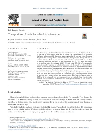 Andréka, Hajnal and Németi, István and Tuza, Zsolt (2025) Transposition of variables is hard to axiomatize. ANNALS OF PURE AND APPLIED LOGIC, 176 (10). No.-103650. ISSN 0168-0072