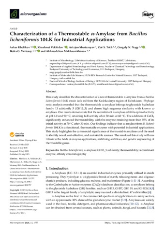 Kholikov, Askar and Vokhidov, Khushnut and Murtozoyev, Azizjon and Tóth, Zoé Sára and Nagy, Gergely and Vértessy, Beáta (Grolmuszné) and Makhsumkhanov, Akhmadzhan (2025) Characterization of a Thermostable α-Amylase from Bacillus licheniformis 104.K for Industrial Applications. MICROORGANISMS, 13 (8). No.-1757. ISSN 2076-2607