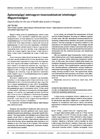 Magyarország jelentős egészségügyi adatkinccsel rendelkezik – több évtizedre visszamenőleg gyűjtött betegadatokkal, kórházi esetszintű nyilvántartásokkal, népegészségügyi információkkal. Ezeknek az adatoknak a felelős és okos hasznosítása új távlatokat nyithat az egészségügyi innovációban és a gazdasági növekedésben. A nemzetközi példák alapján világos, hogy az adatmegosztás terén nem az a kérdés, hogy megtegyük-e, hanem az, hogyan tegyük meg okosan: milyen garanciákkal, milyen üzleti modellekkel és milyen infrastruktúrával. A tanulmányban áttekintettük az izraeli és brit tapasztalatokat, az adat értékének különböző aspektusait, valamint javaslatokat fogalmaztunk meg a köz- és magánszféra közti együttműködések kialakítására. A legfontosabb üzenet a döntéshozók számára az, hogy egy kiegyensúlyozott stratégia kidolgozása szükséges, amely egyszerre védi a polgárok személyes adatainak bizalmasságát, és biztosítja, hogy az adatokból származó érték visszaforogjon a nemzetgazdaságba és az egészségügy fejlesztésébe. Ha sikerül megteremteni a megfelelő jogi kereteket, kialakítani a biztonságos adat-infrastruktúrát és vonzó feltételeket kínálni a kutatópartnereknek úgy, hogy közben a magyar egészségügy is nyer, akkor az egészségügyi adatvagyon valóban a 21. századi magyar gazdaság és egészségügy egyik húzóerejévé válhat. Ehhez pedig politikai akarat, interdiszciplináris együttműködés (egészségügy, informatika, jog, gazdaság területei között) és nem utolsó sorban a társadalom bizalmának elnyerése szükséges. A lehetőség adott, a nemzetközi útjelzők ismertek – most rajtunk múlik, hogyan élünk az adataink adta potenciállal a közös jó érdekében. | Hungary has significant healthcare data resources, including patient records gathered over many years, detailed hospital case databases, and public health information. The responsible and intelligent use of these data assets could lead to innovations in healthcare and stimulate economic growth. International experiences show that the key issue regarding data sharing is not whether to do it but how to do it wisely. This involves examining the essential safeguards, business models, and infrastructure needed.In our study, we analyzed the experiences of Israel and the United Kingdom, focusing on different aspects of data value. We also developed recommendations for fostering collaborations between the public and private sectors. The key message for decision-makers is the importance of a balanced strategy. This strategy should simultaneously protect citizens' personal data privacy while ensuring that the value generated from the data is reinvested into the national economy and healthcare development. We can establish legal frameworks, build a secure data infrastructure, and create appealing conditions for research partners while enhancing Hungarian health - care. In that case, the country's health data assets can transform Hungary's economy and healthcare system in the 21st century. This transformation requires political will, interdisciplinary collaboration among healthcare, information technology, law, and economics, and, importantly, earning society's trust. The opportunity exists, and international best practices are known; how effec - tively we leverage our data for the common good is now up to us.