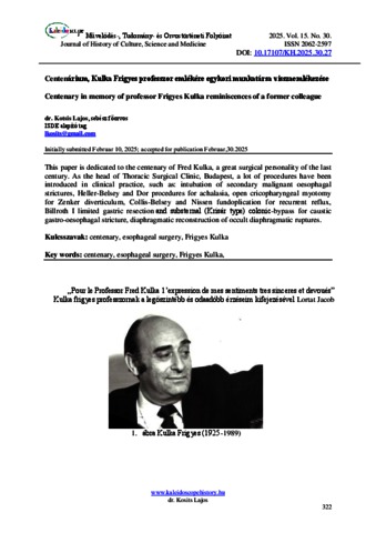 Kotsis, Lajos (2025) Centenárium, Kulka Frigyes professzor emlékére egykori munkatársa visszaemlékezése. KALEIDOSCOPE: MŰVELŐDÉS- TUDOMÁNY- ÉS ORVOSTÖRTÉNETI FOLYÓIRAT, 15 (30). pp. 322-329. ISSN 2062-2597