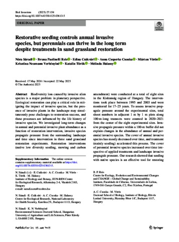 Sáradi, Nóra and Reis Paolinelli, Bruna and Csákvári, Edina and Csonka, Anna Cseperke and Vörös Márton, Vörös and Verbényiné Neumann, Krisztina and Török, Katalin and Halassy, Melinda (2025) Restorative seeding controls annual invasive species, but perennials can thrive in the long term despite treatments in sand grassland restoration. BIOLOGICAL INVASIONS, 27 (6). No.-154. ISSN 1387-3547