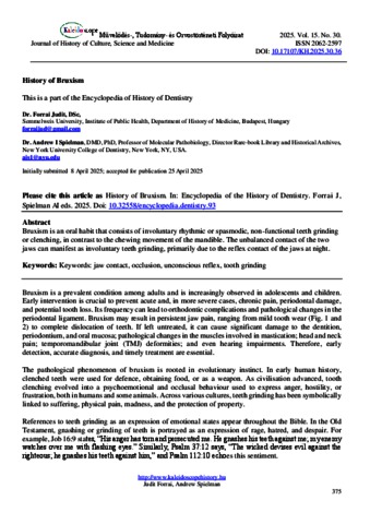 Forrai, Judit and Spielman, Andrew I. (2025) History of Bruxism. KALEIDOSCOPE: MŰVELŐDÉS- TUDOMÁNY- ÉS ORVOSTÖRTÉNETI FOLYÓIRAT, 15 (30). pp. 375-378. ISSN 2062-2597