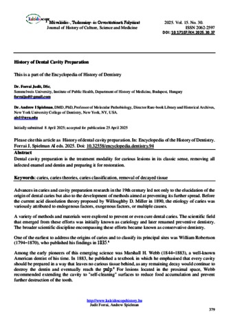 Forrai, Judit and Spielman, Andrew I. (2025) History of Dental Cavity Preparation. KALEIDOSCOPE: MŰVELŐDÉS- TUDOMÁNY- ÉS ORVOSTÖRTÉNETI FOLYÓIRAT, 15 (30). pp. 379-381. ISSN 2062-2597
