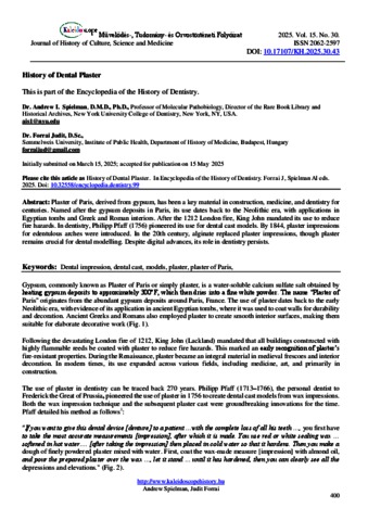 Spielman, Andrew I. and Forrai, Judit (2025) History of Dental Plaster. KALEIDOSCOPE: MŰVELŐDÉS- TUDOMÁNY- ÉS ORVOSTÖRTÉNETI FOLYÓIRAT, 15 (30). pp. 400-403. ISSN 2062-2597