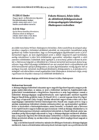 Fazekas, Sándor and Dávid, Péter (2025) Fekete Rómeó, fehér Júlia : Az előítéletek feldolgozásának drámapedagógiai lehetőségei Shakespeare műveiben. ANYANYELVI KULTÚRAKÖZVETÍTÉS, 8 (1). pp. 24-35. ISSN 2063-2991