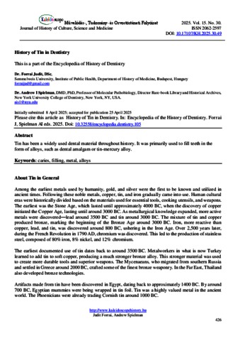 Forrai, Judit and Spielman, Andrew I. (2025) History of Tin in Dentistry. KALEIDOSCOPE: MŰVELŐDÉS- TUDOMÁNY- ÉS ORVOSTÖRTÉNETI FOLYÓIRAT, 15 (30). pp. 426-430. ISSN 2062-2597
