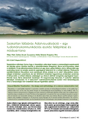Mikes, Márk Zoltán and Dezső, Zsuzsanna and Hollós, Roland and Pongrácz, Rita (2025) Szokatlan Időjárás Adatvizualizáció – egy tudománykommunikációs eszköz felépítése és módszertana = Unusual Weather Visualisation – the design and methodology of a science communication tool. LÉGKÖR: AZ ORSZÁGOS METEOROLÓGIAI INTÉZET SZAKMAI TÁJÉKOZTATÓJA, 70 (3). pp. 143-150. ISSN 0133-3666
