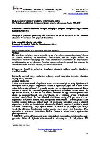 Tenk Miklósné Zsebe, Andrea (2023) Társadalmi szemléletformálást elősegítő pedagógiai program mozgássérült gyermekek inkluzív nevelésében. KALEIDOSCOPE: MŰVELŐDÉS- TUDOMÁNY- ÉS ORVOSTÖRTÉNETI FOLYÓIRAT, 13 (27). pp. 165-177. ISSN 2062-2597