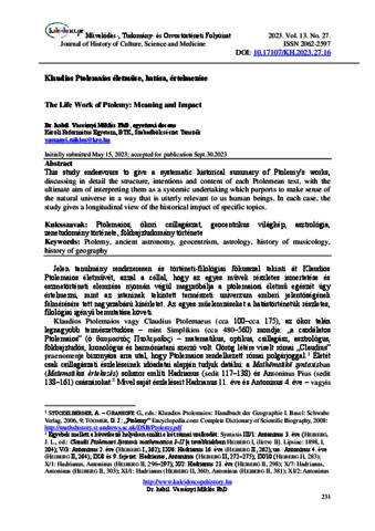 Vassányi, Miklós (2023) Klaudios Ptolemaios életműve, hatása, értelmezése. KALEIDOSCOPE: MŰVELŐDÉS- TUDOMÁNY- ÉS ORVOSTÖRTÉNETI FOLYÓIRAT, 13 (27). pp. 231-263. ISSN 2062-2597