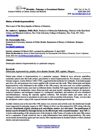 Spielman, Andrew I. and Forrai, Judit (2023) History of dentin hypersensitivity. KALEIDOSCOPE: MŰVELŐDÉS- TUDOMÁNY- ÉS ORVOSTÖRTÉNETI FOLYÓIRAT, 13 (27). pp. 341-343. ISSN 2062-2597