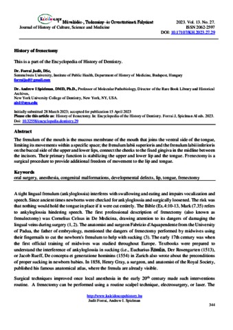 Forrai, Judit and Spielman, Andrew I. (2023) History of frenectomy. KALEIDOSCOPE: MŰVELŐDÉS- TUDOMÁNY- ÉS ORVOSTÖRTÉNETI FOLYÓIRAT, 13 (27). pp. 344-345. ISSN 2062-2597