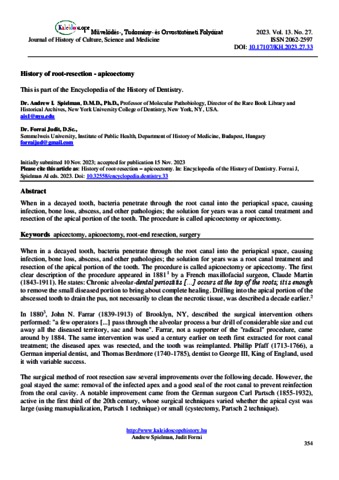 Spielman, Andrew I. and Forrai, Judit (2023) History of root-resection - apicoectomy. KALEIDOSCOPE: MŰVELŐDÉS- TUDOMÁNY- ÉS ORVOSTÖRTÉNETI FOLYÓIRAT, 13 (27). pp. 354-355. ISSN 2062-2597