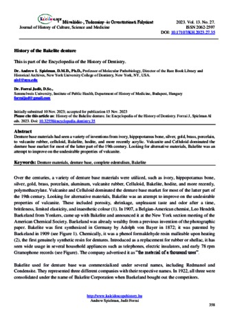 Spielman, Andrew I. and Forrai, Judit (2023) History of the Bakelite denture. KALEIDOSCOPE: MŰVELŐDÉS- TUDOMÁNY- ÉS ORVOSTÖRTÉNETI FOLYÓIRAT, 13 (27). pp. 358-359. ISSN 2062-2597