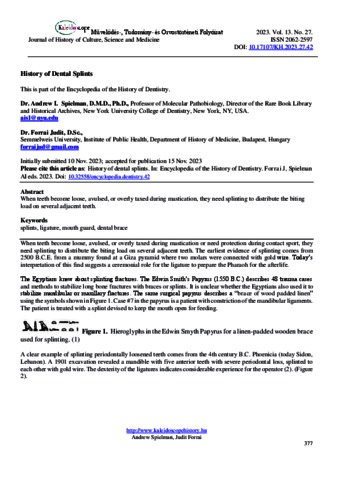 Spielman, Andrew I. and Forrai, Judit (2023) History of Dental Splints. KALEIDOSCOPE: MŰVELŐDÉS- TUDOMÁNY- ÉS ORVOSTÖRTÉNETI FOLYÓIRAT, 13 (27). pp. 377-379. ISSN 2062-2597