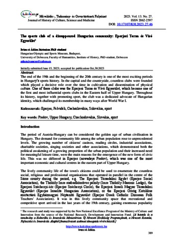 Iváncsó, Ádám (2023) The sports club of a disappeared Hungarian community: Eperjesi Torna és Vívó Egyesület. KALEIDOSCOPE: MŰVELŐDÉS- TUDOMÁNY- ÉS ORVOSTÖRTÉNETI FOLYÓIRAT, 13 (27). pp. 389-400. ISSN 2062-2597