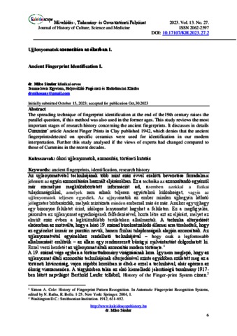 Miko, Sándor (2023) Ujjlenyomatok azonosítása az ókorban I. KALEIDOSCOPE: MŰVELŐDÉS- TUDOMÁNY- ÉS ORVOSTÖRTÉNETI FOLYÓIRAT, 13 (27). pp. 6-12. ISSN 2062-2597