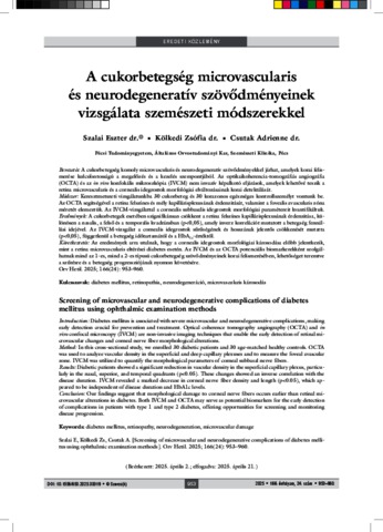 Szalai, Eszter and Kölkedi, Zsófia and Csutak, Adrienne (2025) A cukorbetegség mikrovaszkuláris és neurodegeneratív szövődményeinek vizsgálata szemészeti módszerekkel. ORVOSI HETILAP, 166 (24). pp. 953-961. ISSN 0030-6002