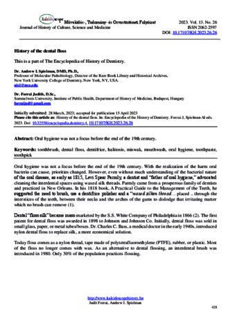 Spielman, Andrew I. and Forrai, Judit (2023) History of the dental floss. KALEIDOSCOPE: MŰVELŐDÉS- TUDOMÁNY- ÉS ORVOSTÖRTÉNETI FOLYÓIRAT, 13 (26). pp. 428-429. ISSN 2062-2597