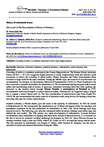 Forrai, Judit and Spielman, Andrew I. (2023) History of orthodontic braces. KALEIDOSCOPE: MŰVELŐDÉS- TUDOMÁNY- ÉS ORVOSTÖRTÉNETI FOLYÓIRAT, 13 (26). pp. 441-443. ISSN 2062-2597