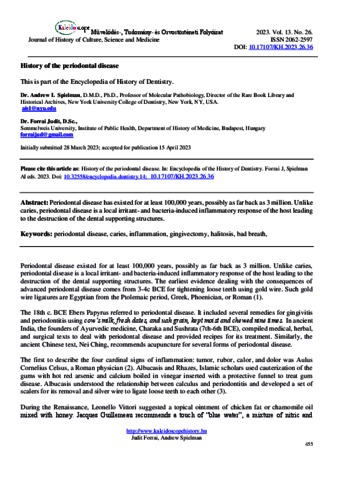 Spielman, Andrew I. and Forrai, Judit (2023) History of the periodontal disease. KALEIDOSCOPE: MŰVELŐDÉS- TUDOMÁNY- ÉS ORVOSTÖRTÉNETI FOLYÓIRAT, 13 (26). pp. 455-457. ISSN 2062-2597