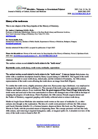 Spielman, Andrew I. and Forrai, Judit (2023) History of the tooth worm. KALEIDOSCOPE: MŰVELŐDÉS- TUDOMÁNY- ÉS ORVOSTÖRTÉNETI FOLYÓIRAT, 13 (26). pp. 463-465. ISSN 2062-2597