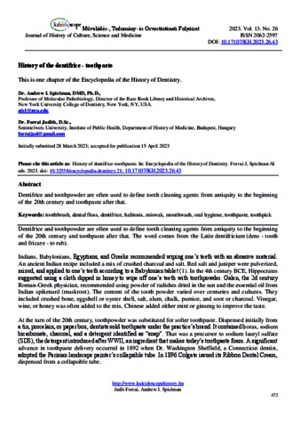 Spielman, Andrew I. and Forrai, Judit (2023) History of the dentifrice - toothpaste. KALEIDOSCOPE: MŰVELŐDÉS- TUDOMÁNY- ÉS ORVOSTÖRTÉNETI FOLYÓIRAT, 13 (26). pp. 472-473. ISSN 2062-2597