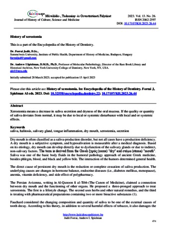 Forrai, Judit and Spielman, Andrew I. (2023) History of xerostomia. KALEIDOSCOPE: MŰVELŐDÉS- TUDOMÁNY- ÉS ORVOSTÖRTÉNETI FOLYÓIRAT, 13 (26). pp. 474-476. ISSN 2062-2597